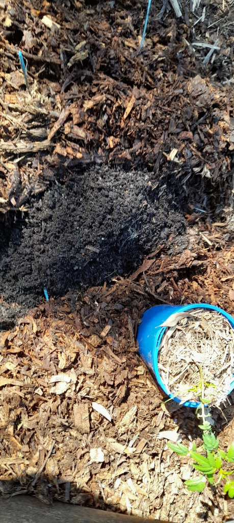 5. Plant your plants in evenly spaced holes around the bed. We used a mixture of perennial basil, mountain marigolds, salvias and bromeliades to provide humidity and plenty of yellow and blue flowers which are favoured by native and honey bees alike.