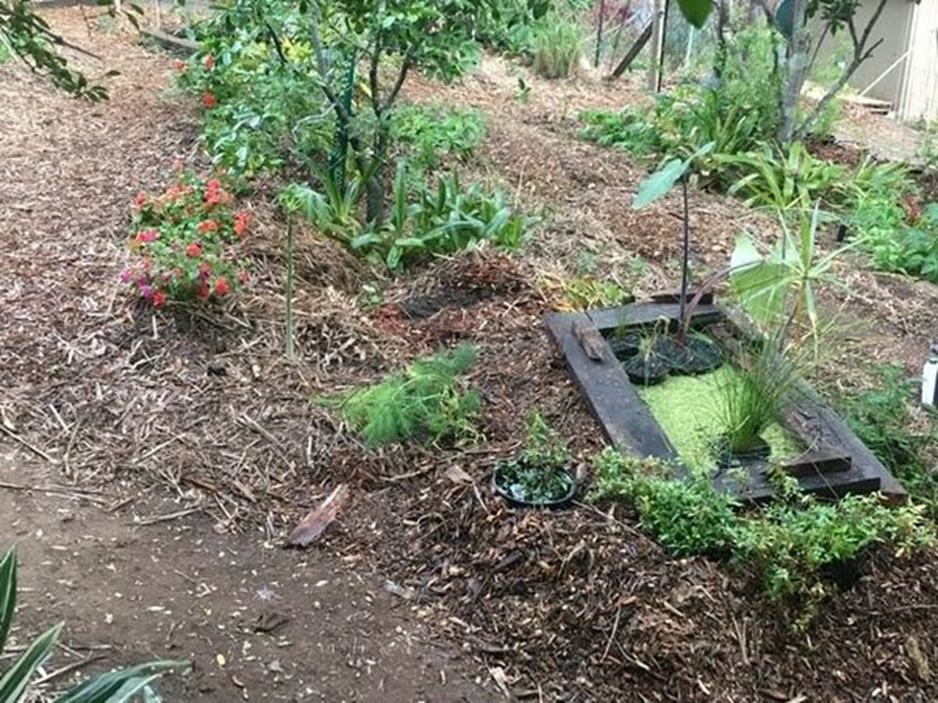 It’s amazing the difference a little bit of permanent water makes to the feel of a place. We have several frog ponds around our emerging food forest. Some of the simplest (and most cost effective) ponds can be made using cast iron bath tubs half filled with old bricks (we avoid holes with plastic lining as we also grow edible plants in the ponds). Reeds (native Juncis or similar) are then added to the pond in pots with a layer of gravel over the surface of the soil to weigh the pots down and keep the soil in place. The addition of floating aquatic plants such as Azolla pinnata (Australian native) on the surface of the pond makes it safe for bees and other insects to get a drink. A few small native fish such as Crimson Spotted Rainbow Fish (Melanotaenia duboulayi) are also an excellent addition to ponds for the control of mosquito larvae. For these ponds we’ve also added a few cut sleepers around the top but large flat rocks obviously work really well to disguise the tubs too. If you don’t have a large tub try nestling a bucket in a pile of mulch and adding some aquatic plants. The effect can be surprisingly good.